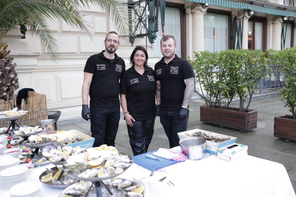 Bestens gelabt wurden die Gäste von FromFranz Catering. Das Austernbuffet zauberte Fischvierterl auf die Terrasse. Dazu wurden alkoholfreie Getränke von Coca-Cola, Weine aus dem Hause Dolle, Bier von Salm Bräu, Schlumberger-Sekt sowie Spirituosen von Vienna Spirits gereicht.