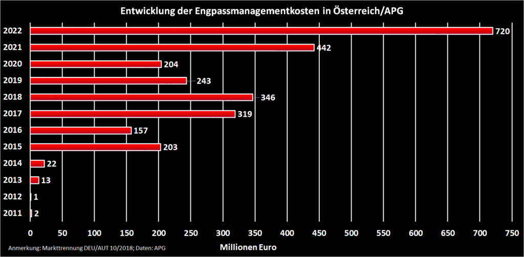 Ein Nebeneffekt sind die explodierenden Kosten für Ausgleichsmaßnahmen („Re-Dispatching“ oder Engpass-Management genannt), die unmittelbar mit einer unzureichenden Infrastrukturanpassung im Zusammenhang stehen. 2011 haben die Ausgleichsmaßnahmen in Österreich noch rund 2 Millionen Euro gekostet. 2022 waren es bereits 720 Millionen Euro. Diese Kosten bedingen steigende Netzentgelte, ein wesentlicher Bestandteil der Stromrechnung.