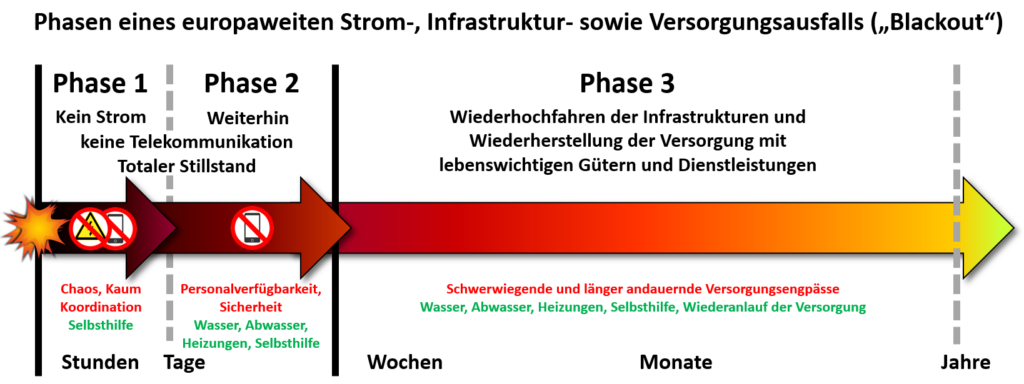 Eine überregionale Großstörung in Europa würde unmittelbar zum Ausfall der meisten „kritischen Infrastrukturen“ und damit zur Unterbrechung der lebenswichtigen Logistikketten führen. Der Zusammenbruch beginnt mit dem Ausfall von Telekommunikationssystemen (Mobilfunk, Festnetz, Internet). Das würde dazu führen, dass so gut wie alle Versorgungsleistungen nur mehr sehr eingeschränkt zur Verfügung stehen: das Finanzsystem (Bankomaten, Kassen, Geld- und Zahlungsverkehr), der Verkehr (Ampeln, Tunnels, Bahnsysteme, Tankstellen) und damit die gesamte Versorgungslogistik (Produktion und Verteilung von Lebensmitteln, Medikamenten und sonstigen Gütern aller Art) bis hin zum Ausfall regionaler Trinkwasseranlagen und zum Versagen der Abwasserentsorgung.