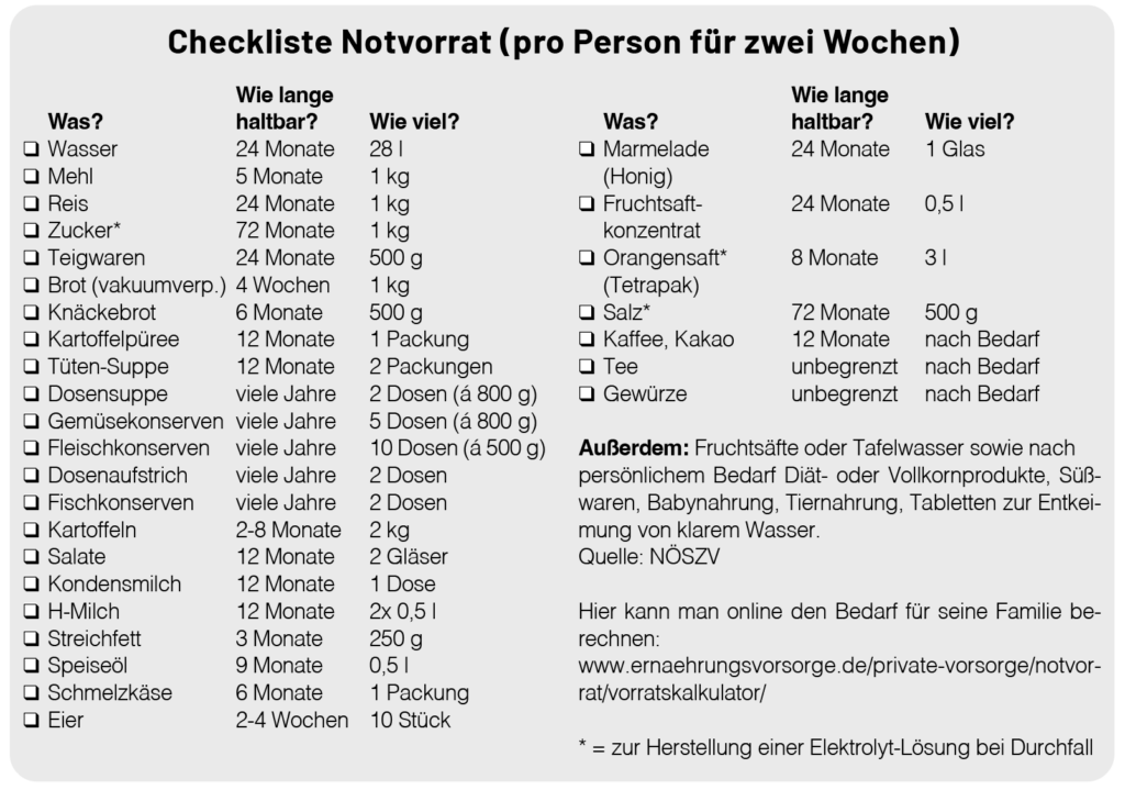 Die Zivilschutzverbände raten dazu, dass jeder Haushalt über einen Notvorrat verfügt. In Österreich wird empfohlen, sich für 14 Tage mit Vorräten einzudecken. Dazu gibt es verschiedene Checklisten für den Notvorrat. Das sind aber nur Beispiele – die Antwort auf die Frage, was man einlagern sollte, richtet sich nach vier verschiedenen Faktoren.